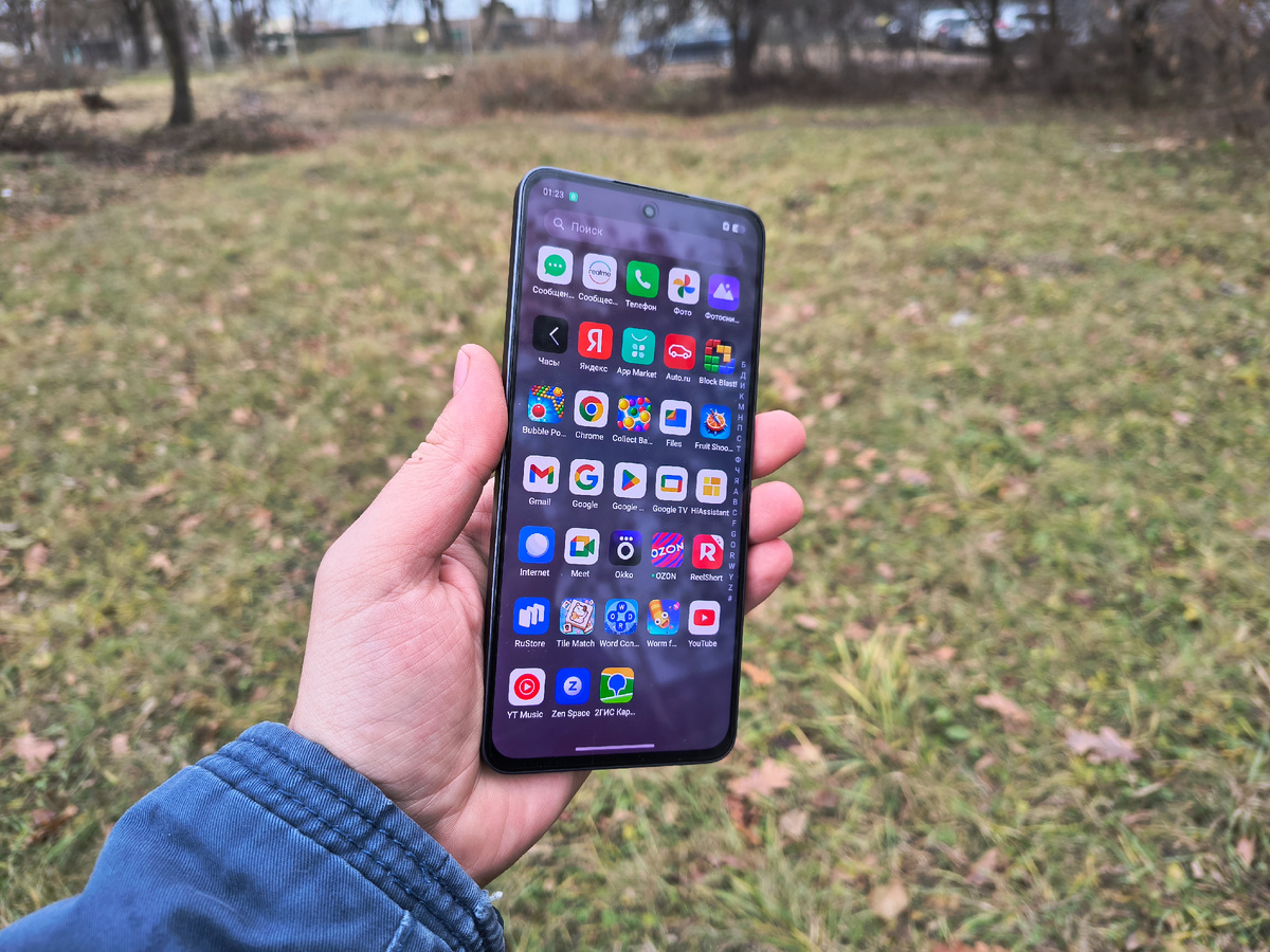 И снова всем доброго времени суток. Сегодня в моих руках Realme 13+, о котором мне есть что рассказать. Занимайте удобную позу, приятного прочтения. Комплект стандартный для компании. Жёлтая коробка, прозрачный силиконовый чехол, плёнка с завода на экране, а также блок зарядки на 80W. Хороший комплект. Эргономика устройства мне тоже понравилась. Несмотря на плоские грани, спинка скруглена со всех сторон, за счёт чего телефон комфортно ложится в ладонь и лежит весьма цепко. Корпус из пластика, на спинке имеется приятный глазу узор. Пластик матовый, достаточно скользкий, без чехла я бы не рискнул его носить. Блок камеры снова выполнен в виде шайбы с хромированным металлическим рифленым кольцом. Самый мне ненавистный вид камеры. Выпирает прилично, создаёт эффект клёвого камерофона, хотя полезная камера всего одна и такая шайба отнюдь не оправдана. Последнее время каждый китайский смартфон идёт в таком стиле, отчего они теряются в толпе и становятся абсолютно безликими. Осуждаю. Что для ва