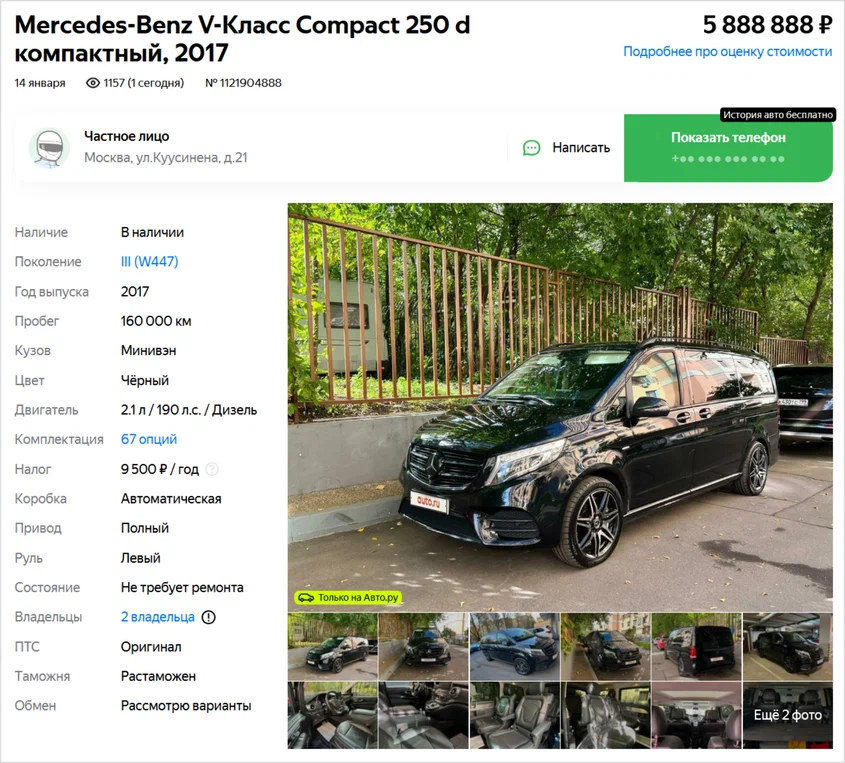 Герой этого выпуска — Mercedes-Benz V-класса, который продают в Москве почти за шесть миллионов рублей. Это полноприводный вариант 2017 года выпуска в богатой комплектации. И кажется, он готов ещё долго с комфортом возить пассажиров: пробег составляет умеренные 160 тысяч километров, а на фотографиях машина выглядит очень прилично.