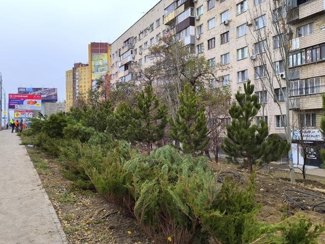 На улице им. Маршала Рокоссовского в Волгограде продолжаются работы по благоустройству территории, в рамках которой проводят озеленение на участке между улицей Двинской и Невской. По линии разделительных островков вдоль проезжей части высаживают крымскую сосну, скальный можжевельник, а также несколько сотен кустарников местного казацкого можжевельника. Он, кстати, помимо того, что является очень выносливым и неприхотливым кустарником, еще и самый ядовитый из всех известных можжевельников. На сегодняшний день рабочие уже высадили вереницу хвойных деревьев и кустарников на несколько десятков метров от остановки общественного транспорта на улице Невской. Не засаженная пока полоса земли, простирающаяся вдоль проезжей части до улицы Двинской, изрыта неглубокими траншеями. В некоторых местах лежат смотанные катушки шлангов. Помимо озеленения, рабочие обновляют и поливочную систему. Ветвистые сосны виднеются также и на участке улицы им. Маршала Рокоссовского в промежутке от ул