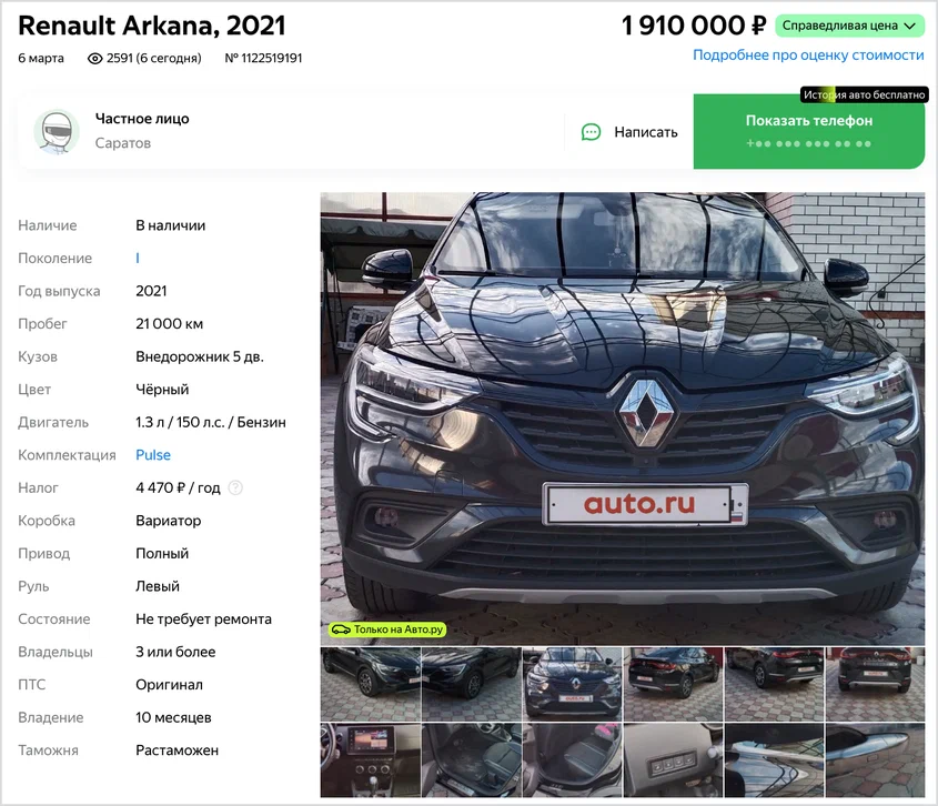 На российской вторичке много автомобилей Renault — это заметно и по рубрике «Не бит, не крашен», в которую машины французской марки попадают регулярно. Относительно недавно мы рассказывали о свежем Логане «в идеальном состоянии», который на самом деле пережил ремонт половины кузова. А сегодня у нас вновь «француз» с небольшим пробегом. Какие же сюрпризы обнаружатся в его истории? Renault Arkana 2021 года выпуска продают в Саратове за 1,9 миллиона рублей. Полноприводный кроссовер с турбомотором, согласно одометру, проехал всего 21 тысячу километров. И выглядит он вроде бы соответствующе. Снимки в объявлении не лучшего качества, но заметных изъянов на машине действительно нет. В комментарии автора объявления, который представляется собственником, тоже нет ничего необычного. Максимальная комплектация, два комплекта резины, вложений не требует. Я собственник. Поэтому единственное, что слегка смущает в этом объявлении, — дата размещения. Популярную Аркану со скромным пробегом и справедливо
