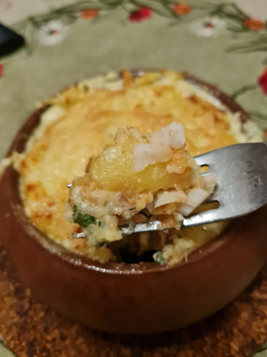Рыбу режем кусочками, обваливаем в смеси муки с солью и иными специями, обжариваем на сковороде до полуготовности. Картофель отвариваем, режем кружочками, обжариваем на сковороде (не обязательно на самом деле, просто мне так больше нравится). Готовим соус: разогреваем сливочное масло, добавляем муку, перемешиваем, добавляем молоко, перемешиваем, чтобы не было комочков и варим на малом огне до загустения соуса. Зелень режем мелко (зелень не является обязательным ингредиентом, просто она у меня была). Сыр трем на крупной терке. В горшочек укладываем слой картофеля, затем слой рыбки, зелень, заливаем соусом и сверху кладем сыр. Запекаем в духовке до золотистой корочки сыра. Достаем и наслаждаемся прекрасным ужином.