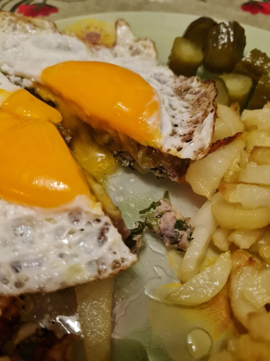 Достаем, посыпаем тертым на крупной терке сыром и отправляем в духовку еще на 10 минут. Яйца жарим на сковороде, как обычную глазунью. Достаем наши котлетки из духовки, укладываем на тарелочку, сверху кладем наше яичко. Приятного аппетита!