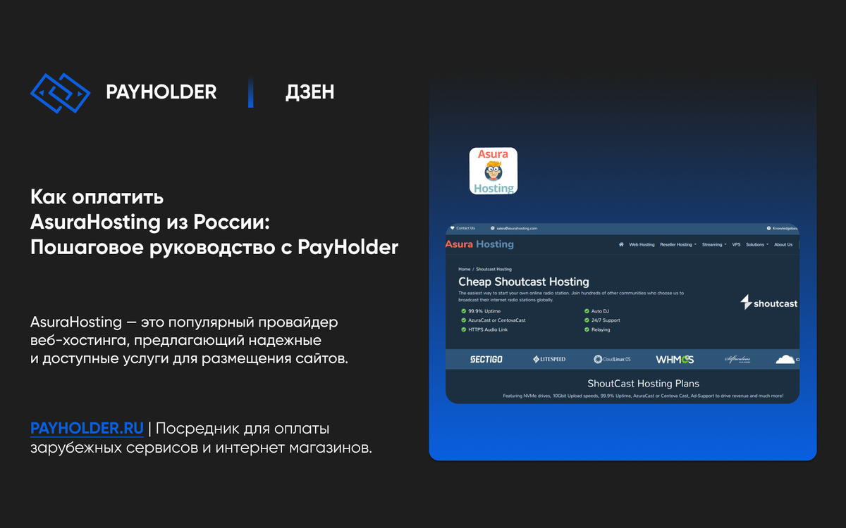AsuraHosting — это популярный провайдер веб-хостинга, предлагающий надежные и доступные услуги для размещения сайтов. Однако из-за текущих ограничений пользователи из России могут столкнуться с трудностями при оплате подписки. В этой статье мы расскажем, как оплатить AsuraHosting из России с помощью сервиса PayHolder и продолжить пользоваться всеми возможностями этого хостинг-провайдера. AsuraHosting — это провайдер веб-хостинга, предлагающий быстрые, безопасные и масштабируемые решения для размещения сайтов. Платформа популярна среди владельцев малого бизнеса, блогеров и веб-разработчиков благодаря низкой стоимости и высокому качеству услуг. Доступные тарифные планы Высокая производительность серверов Простое управление Неограниченный трафик Надежная защита Из-за международных ограничений российские пользователи могут столкнуться с проблемами при попытке оплатить подписку на AsuraHosting с помощью традиционных методов, таких как банковские карты. Однако эти трудности можно легко обойт
