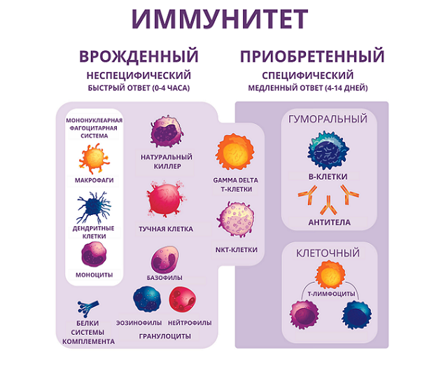 - Врожденный иммунитет — это первая линия защиты организма, которая активируется сразу после проникновения патогенов. Он является быстрым, но неспецифичным и не имеет памяти. Основную роль в врожденном иммунитете играют фагоциты, такие как макрофаги, нейтрофилы и клетки естественного убийцы (NK).