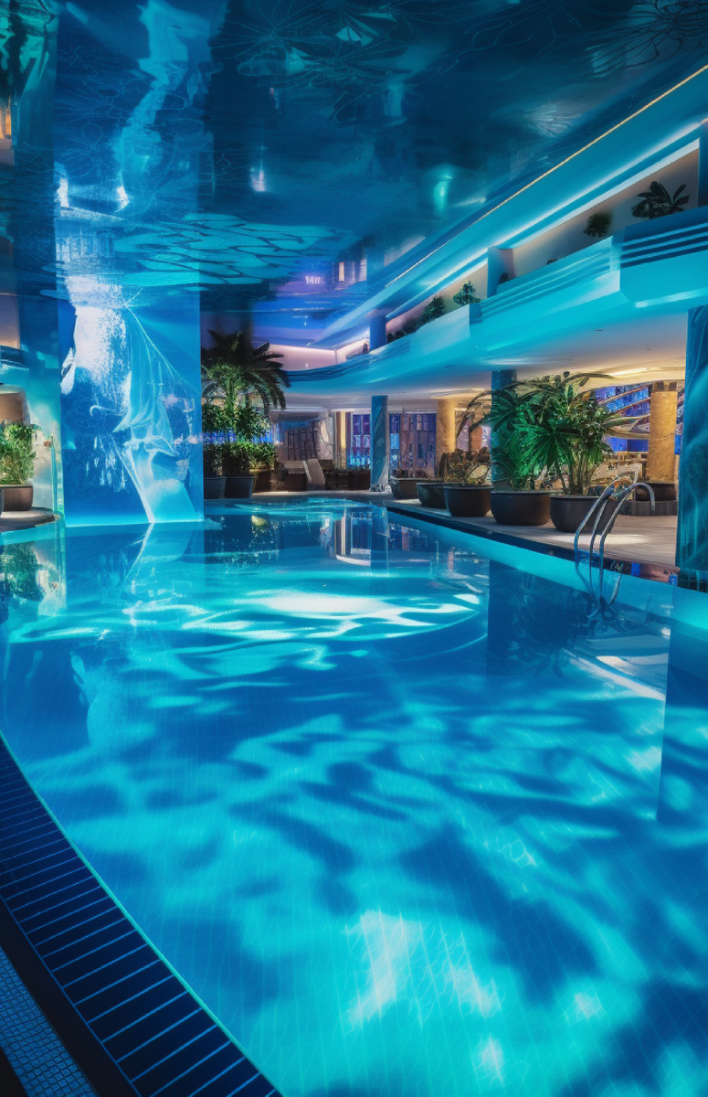 Яркая особенность иммерсивных бассейнов – способность создавать уникальный климат и окружение внутри бассейна. Например, при использовании различных ароматов и светового оформления создается атмосфера тропического леса или морского бриза. Преимущества иммерсивкого бассейна заключаются в его способности адаптироваться под любое настроение. Отдых становится максимально комфортным и запоминающимся.