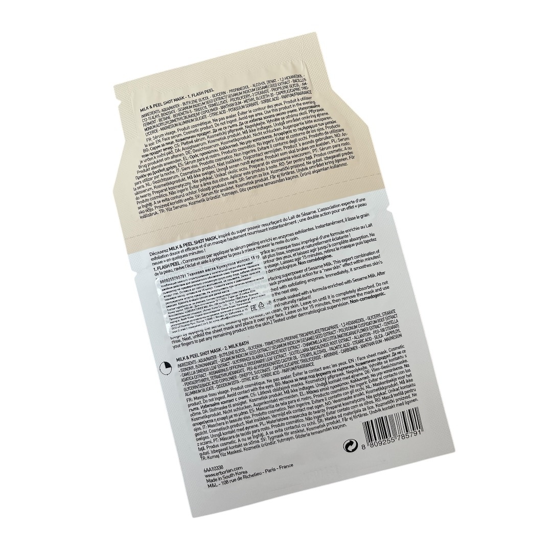 Тканевая маска для лица от Erborian milk & peel shot mask Кунжутное молоко на обзоре. Я люблю этот корейский бренд, их bb крем это моя любовь уже много лет. Упаковка стандартная, но состоит из двух частей через перфорацию, по которой их легко отделить: 1. экспресс-пилинг-сыворотка с мягкими отшелушивающими энзимами, наносим до полного впитывания, не смываем. Впитывается достаточно быстро, вкусно пахнет, сыворотка бело-прозрачного цвета, не липкая, никаких неприятных ощущений. Цвет лица действительно через время улучшается. 2. далее сверху наносим тканевую маску и держим 15 минут. Лекало необычное, сама ткань приятная, мягкая, пропитана большим количеством эссенции белого цвета, что по форме: очень большой вырез для губ и возле носа, но немного ткани на подбородок, для некоторых оно будет маловато. Держится хорошо, не сползает. Объем 18 гр. После пилинга нет покраснений, но эффект есть, как после пилинга пошли чешуйки (не критично) через некоторое время, кто делал пилинг, тот знает