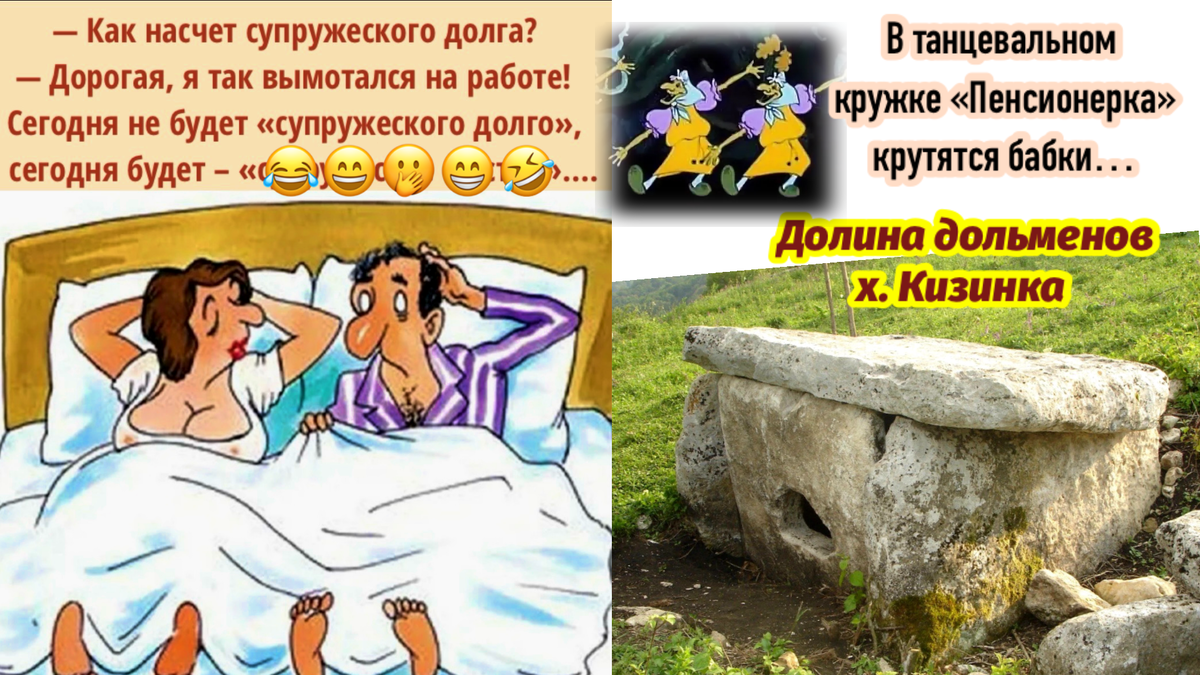 Подруга просила мужа купить ей «Лексус» и все время приговаривала: — Будем с детьми на прогулки ездить… Её муж, недолго думая, подарил ей щенка с гравировкой на ошейнике «Лексус» и открытку с надписью: «Мечты сбываются — гуляйте на здоровье!» /анекдот для хорошего настроения/ Сегодня хочу рассказать вам об интересных достопримечательностях того места, в котором я живу. ✅ Речь пойдёт о дольменах, которые находятся недалеко от хутора Кизинка (это Мостовской район Краснодарский край) 🔥 А в качестве бонуса в конце публикации ⤵️⤵️⤵️ вас ждут весёлые, юмористические картинки (фотографии) с надписями, которые я сделала сама (используя нейросеть, редактор и другие инструменты), надеюсь, что они поднимут вам настроение Итак моя маленькая экскурсия. Дольмены - это непонятные сооружения, которые строили люди несколько тысячелетий назад. До сих пор не известно для чего их строили. Кто-то говорит, что дольмены- это древние гробницы, места куда уходили мудрецы, чтобы умереть и потом их дух помо