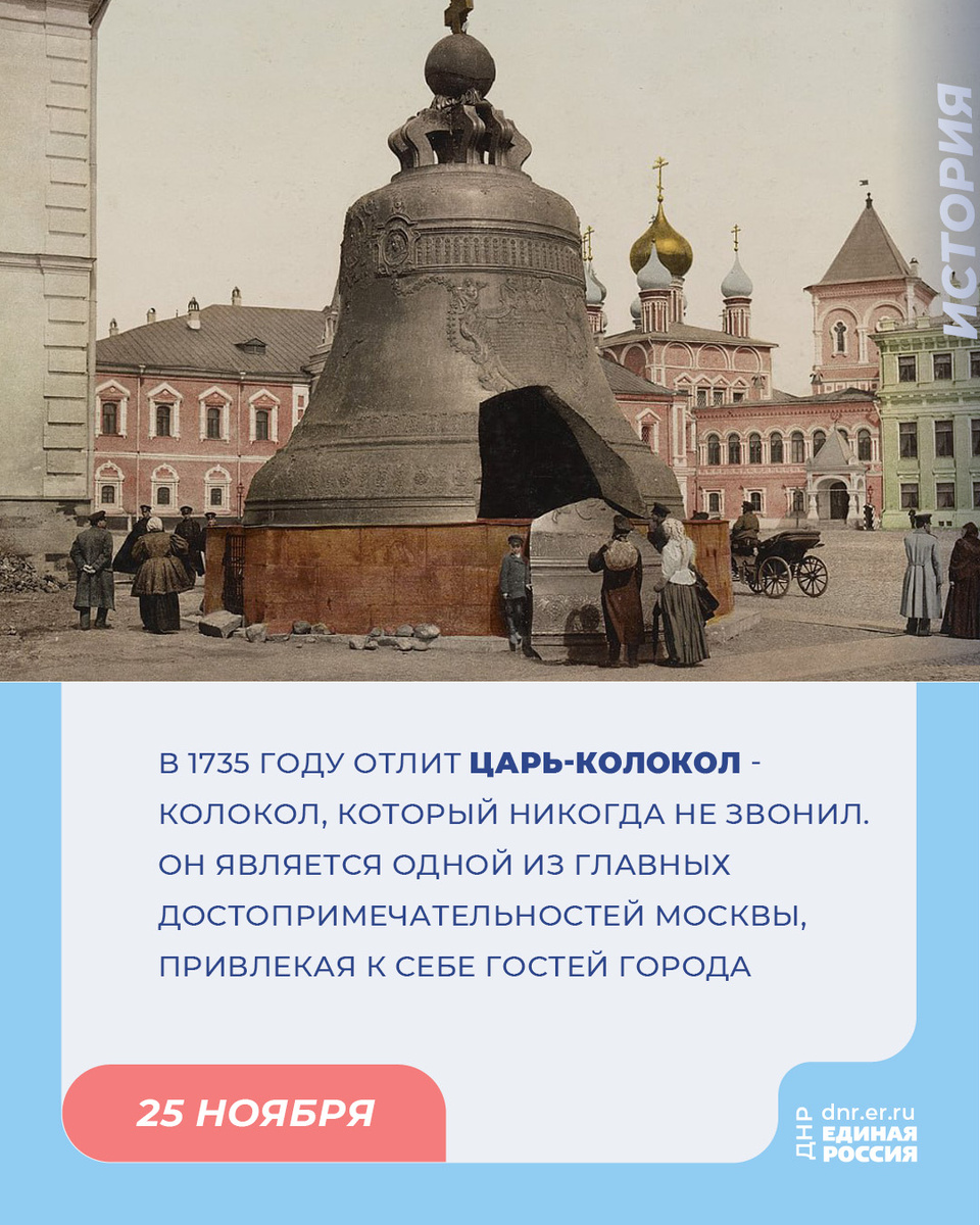 🔔25 ноября 1735 года завершили работы над знаменитым Царь-колоколом. Он является одним из самых больших и тяжелых колоколов в мире – его вес составляет более двухсот тонн. Несмотря на то, что по назначению его никогда не использовали, по сей день колокол – одна из главных кремлевских достопримечательностей. История колокола берет свое начало в 1730 году, когда императрица Анна Иоанновна издаёт указ: отлить огромный колокол. Мастерами, исполнившими это чудо, стали московские литейщики: отец и сын Иван и Михаил Моторины. Сначала написали чертежи, потом изготовленную модель отправили на согласование в Петербург. На Ивановской площади в Кремле вырыли яму в десять метров глубиной, а пространство между формой колокола и стенами литейной ямы засыпали землёй и утрамбовали, чтобы кожух выдержал давление расплавленного металла. К работе привлекли более ста мастеров: печников, каменщиков, плотников, кузнецов и их помощников. Однако первая попытка оказалась неудачной. Вторая плавка проходила при