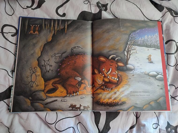 Очень порадовал твёрдый переплёт и плотные страницы, специально сделанные, чтобы детям было удобно переворачивать, их сложнее порвать. Удобный формат, чтобы брать в маленькие ручки. Кто же такой Груффало? Страшный зверь, которого все боятся? После описания этого страшного зверя тоже начинаешь бояться вместе со всеми животными. Но оказывается всё наоборот: Груффало самый пугливый, его смог даже мышонок напугать. Большой размер, увы, ничего не значит, ни клыки, ни когти, ни даже бородавка с ядом не спасают, когда