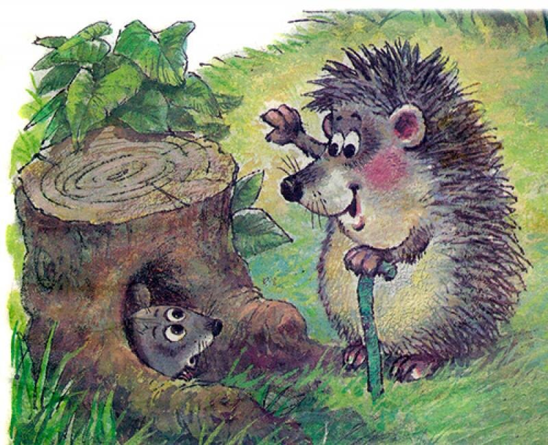 Было раннее утро, вдоль дощатого забора шел Ёжик, у него на спине были яблоки и грибочки. Вдруг его окликнул маленький Мышонок, который спросил: - Ты кто, зверь с колючками? Случайно не кошка? Ёжик усмехнулся и решил подшутить над мышонком: - Нет, кошки – они гладкие и пушистые. А я… я… я – собака! Мышонок задумался, потом произнёс: - Мама говорила, что главные враги мышей – кошка, лиса, хорёк, куница, ласка, рысь, ночная сова, ястреб, коршун. Собак в этом списке нет…. «Ага, а вот ежей твоя мама пропустила! – подумал про себя Ёжик.- Ежи всеядны, они едят всё, от насекомых, земляных червей, лягушек, мышей, змей, до грибов и ягод». В этот момент краем глаза Ёжик увидел подкрадывавшуюся к Мышонку кошку. Прыжок! Но Ёжик уже успел запихнуть под себя Мышонка и свернулся клубком. - Ёжик, ну что ты делаешь! – возмутилась Кошка. – У тебя же есть что покушать, вон сколько яблок и грибов. Отдай мне Мышонка! - Нет, Кошка, не отдам! – решительно ответил Ёжик.– Жалко мне такого несмышлёныша, он и жи