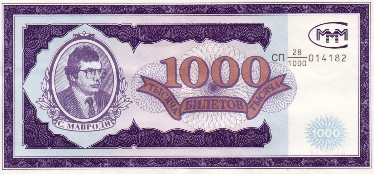 Даже когда Минфин отказал в дополнительной эмиссии, Мавроди не остановился. Он выпустил в продажу билеты со своим портретом, “мавродики”. Ими некоторые фирмы даже умудрялись зарплату платить.