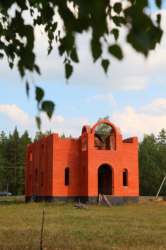 Для нового храма отец Дмитрий выбрал место на въезде в поселок. Кирпичные стены уже возведены и намекают на будущее величие здания, но стройка движется медленно.
