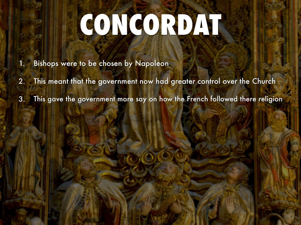 История конкордатов уходит корнями в Средние века. Одним из первых известных примеров является Вормсский конкордат 1122 года, который положил конец конфликту между папством и Священной Римской империей по вопросу инвеституры — права на назначение епископов. Этот документ стал символом компромисса между церковной и светской властью. В последующие века конкордаты стали важным инструментом для урегулирования отношений между католической церковью и различными государствами. Они помогали избежать конфликтов и обеспечивали определённый баланс интересов. 1. **Французский конкордат 1801 года** Один из самых известных конкордатов был заключён между Наполеоном Бонапартом и папой Пием VII. Этот документ восстановил католическую церковь во Франции после периода Революции, когда церковь была лишена многих привилегий. Конкордат 1801 года установил правила взаимодействия между церковью и французским государством, включая назначение епископов и финансирование религиозных учреждений. Эти соглашения меж