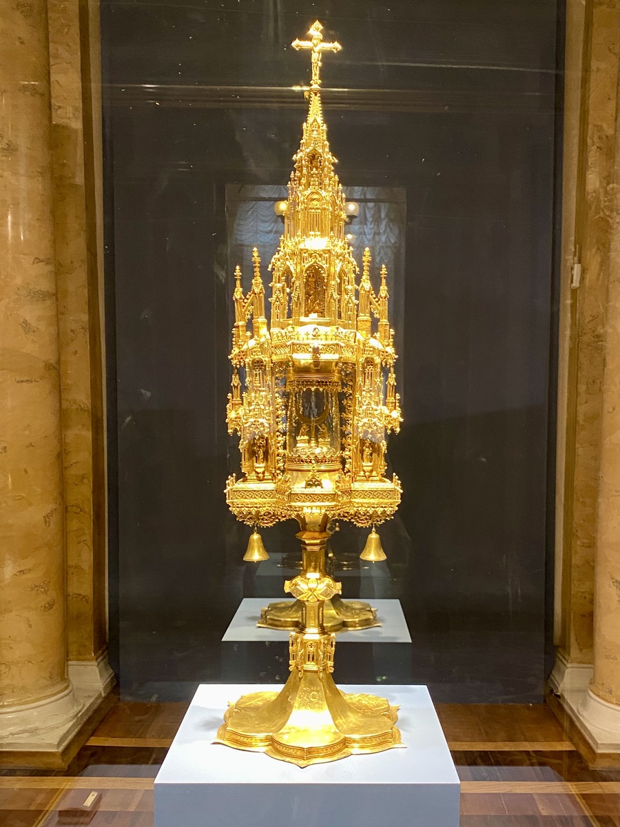 Монстранц – в католической церкви вещь довольно распространенная. Сосуд для публичной демонстрации гостии стал непременной частью церковного обихода в XIII веке и порою, стараниями опытных европейских мастеров, превращался в настоящий шедевр ювелирного искусства. Этот великолепный образец из коллекции «Эрмитажа» имеет еще и «автограф», благодаря которому нам известно сегодня, что сделан он был в 1474-м ювелиром из Ревеля Гансом Рисенбергом. Настоящее чудо чрезвычайно тонкой работы из позолоченного серебра не покидало Ревеля более двух столетий и полагаю было для города предметом настоящей гордости. Но времена бывают разные… В 1711-м магистрат Ревеля счел за благо преподнести сей роскошный монстранц в дар генерал-губернатору годом ранее завоеванной Эстляндии светлейшему князю Александру Даниловичу Меншикову. Драгоценный дар оказался в строящемся Петербурге, где каменные здания в ту пору можно было пересчитать по пальцам да и строительство Меншиковского дворца еще было в самом н