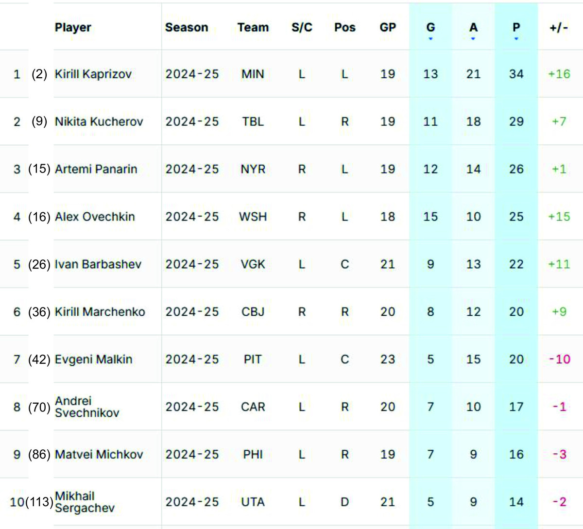 Топ-3 наших бомбардиров не меняется уже 4 неделю: Кирилл Капризов (34 (13+21) очка в 19 матчах), Никита Кучеров (29 (11+18) очков в 19 матчах) и Артемий Панарин (26 (12+14) очков за 19 матчей). Отмечу появление Михаила Сергачева в десятке лучших бомбардиров, у Сергачева 14 (5+9) очков в 21 матче.