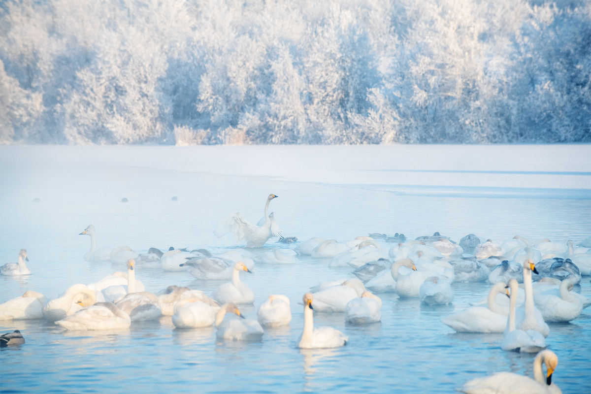 С наступлением холодов лебеди устремляют свои грациозные шеи и клювы на юг. Задумывались ли вы, где конкретно пережидают скрипучие морозы крылатые символы любви и верности? В России обитает несколько видов лебедей. Шипуны на зиму летят на Чёрное, Каспийское и Средиземное моря, а также озёра Средней Азии. А кликуны, названные так по способности издавать протяжный трубный звук, — пережидают холода на Алтае. В горном крае есть одно-единственное место, где для этого природой созданы все условия. Примерно в часе езды от Горно-Алтайска плещутся воды озера Светлое. Они кристальной чистоты и не замерзают зимой из-за обилия бьющих со дна ключей. Даже при сильном минусе температура воды не опускается ниже +4… 6 °C. Этой особенностью и пользуются птицы. Лебеди-кликуны облюбовали озеро в конце 1960-х и явно активно рекомендуют алтайское озеро своей семье. Изначально на водоёме было не более 20 перелётных птиц, а в последние годы — не менее пяти сотен. Компанию лебедям составляют несколько тысяч ут