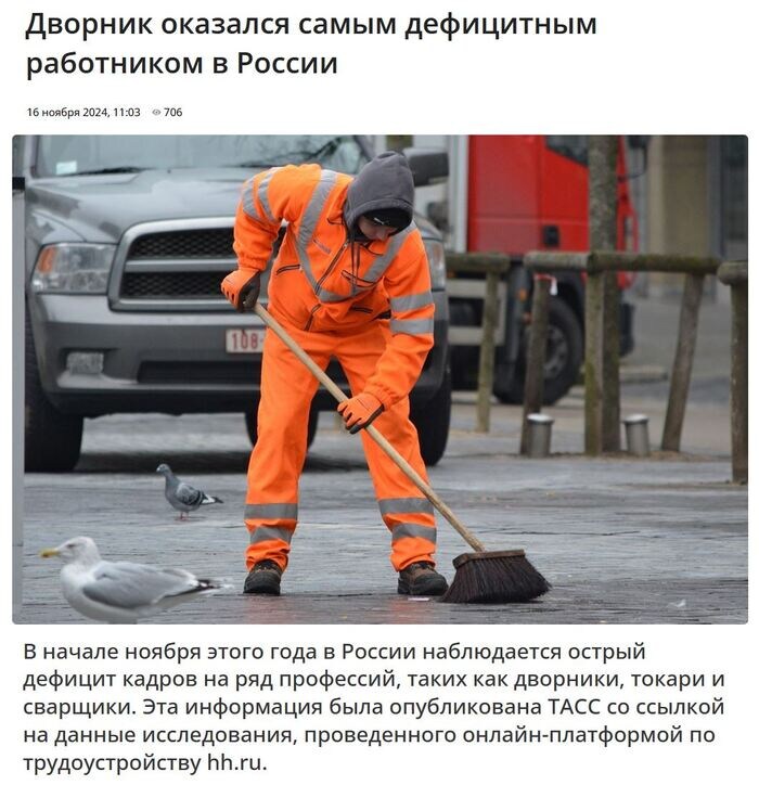Сначала новость. А теперь моя история: Потребовалось мне тут официальное трудоустройство. Казалось бы, дворники нужны везде, здоровье позволяет, да и с утра лопатой/метлой помахать полезно. 1. местная пекарня, висит объявление "срочно требуется дворник". 2 недели бегал, искал руководителя, в итоге "мести у нас особо нечего, оф. оформления нет"; 2. магазин недалеко от дома.да, требуется, но не прямо сейчас, а когда снег выпадет, оформление есть, но потом". Оставил номер, звоните, мол, когда созреете. Внезапно в конце ноября выпал снег! Вчера вижу в местном паблике объявление, что очень срочно туда требуется дворник, написал: 3. Местная поликлиника. Врачи жалуются, что дворника нет, а вот он я, такой красивый! Но надо пройти финального босса - главврача, который сидит в другой больнице и там всё почищено, а проблемы индейцев, как известно... Поэтому опять же высиживали до снега. Высидели, завтра иду оформляться, приступлю к работе на неделе. И да, тут предупредили сразу, что шанцевый инс
