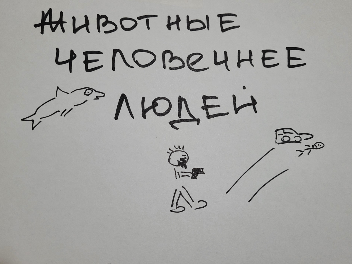 Акула притащила в пасти живую черепаху к лодке с людьми, чтобы они помогли. На шею черепахи намоталась какая - то верёвка. Представляете? Морские обитатели помогают друг другу. Пока люди обрезали верёвку и обрабатывали рану на шее у черепахи, акула и пару дельфинов кружили рядом с лодкой. Они ждали удостовериться, что всё с черепахой в порядке. Благодарный дельфин подплыл к лодке и позволил человеку себя погладить. Морские обитатели по - настоящему радовались за спасенную черепаху. Акула... Дельфины... Черепаха... А теперь заглянет в мир людей. Не будем смотреть слишком глубоко, а то ещё затянет. Вот история из вчера. Город Маркс Саратовской области. Водитель "Land Cruiser" не поделил дорогу с водителем "Оки". И так это задело армянскую честь водителя Крузака, что он начал стрелять по людям в "Оке". Он убил одного человека и ранил второго просто из - за того, что его, типа, подрезали. А может и не подрезали. Может просто не уступили дорогу. А может и не должны были уступать...