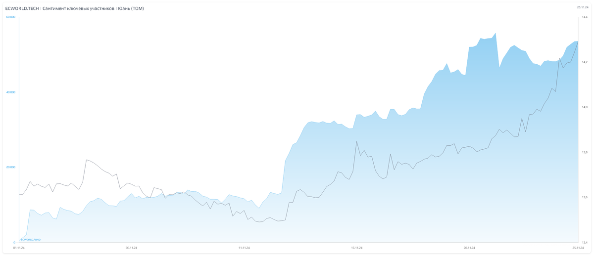Не надо стесняться. (с) ЦБ [усилиями банков] продолжает валить курс рубля: мы наблюдаем осознанную системную девальвацию. Спрос на валюту со стороны "уполномоченных банков" продолжает оставаться стабильным и крайне высоким (см. ниже рост голубой волны спроса со стороны ключевых участников - и там же хорошо видно, как во второй декаде ноября новый виток девальвации начался с импульсного роста спроса со стороны этих ребят): Очевидно, что это согласованное решение, но помогающее зарабатывать и им (мы увидим плоды этого в отчетности банков). Таким образом, юань сегодня на торгах прибавляет сегодня еще +2,4% в моменте. Рост до 14,40 - и мы наблюдаем обновление 2,5-летних максимумов в валюте (вернулись к тем значениям, которые не видели с марта 2022 года): Расчетный курс доллара - 104,4 рубля: "Никаких вам дешевых подарков к Новому году", - решили ребята и погнали разгонять инфляцию (через наращивание курса) дальше. Удивительно ли это? Нет. Это ожидаемо. 1,5 месяца назад, когда курс доллара
