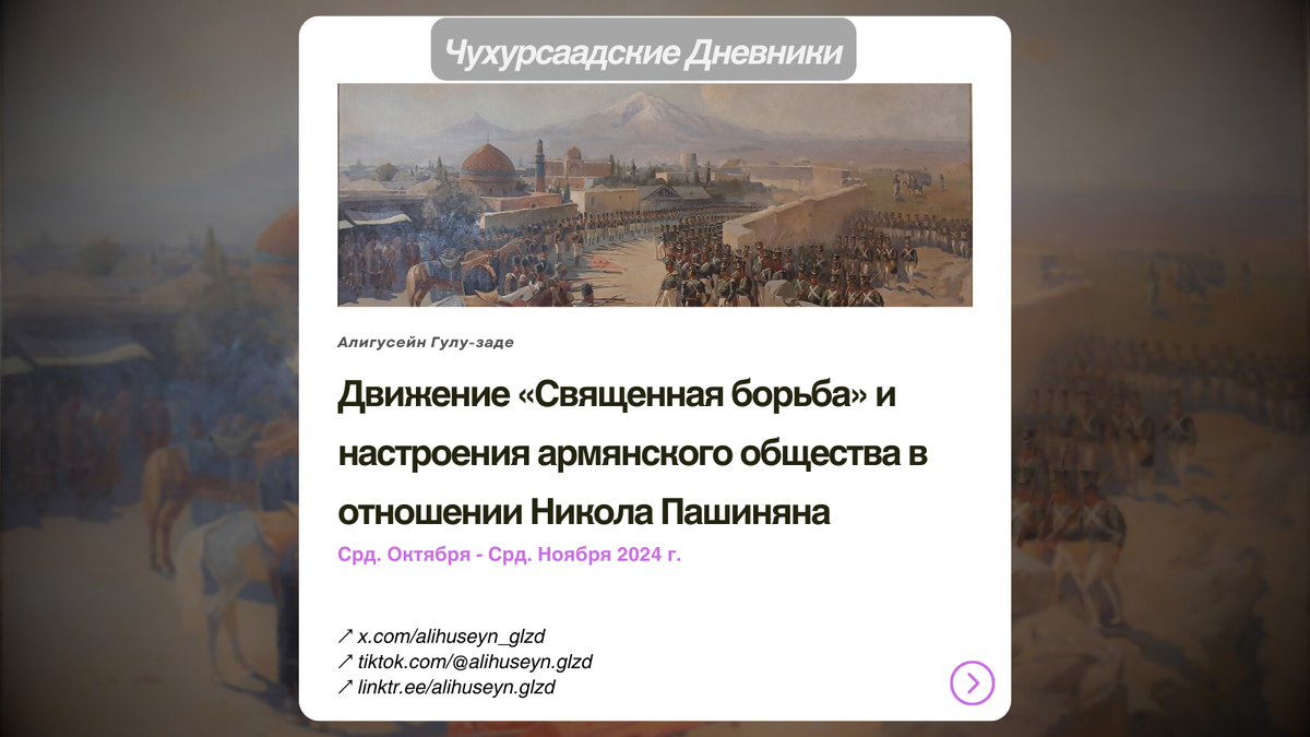 В данном материале цикла «Чухурсаадских дневников», посвященных сугубо внутриполитической ситуации Армении, речь пойдет о движении «Священной борьбы» и оценки армянского общества относительно деятельности власти. В конце будет дан соответствующий прогноз относительно дальнейших событий.
