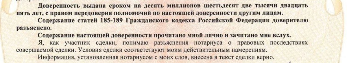 Как следует из ст. 186 Гражданского кодекса РФ, если в доверенности не указан срок ее действия, она действует всего лишь год. А вот если указывать срок действия, какой выбрать лучше всего? Наверняка лучше с запасом, чтобы хватило подольше! Вот так, видимо, и рассуждал один из доверителей, который уполномочил своего поверенного на 10 062 025 лет. При этом характерно, что доверенность исполнена на специальном бланке, значит, оформлена у нотариуса. Но если рассудить здраво, тот же самый поверенный вряд ли доживет до окончания срока полномочий... Поэтому нашли гениальный выход: доверенность можно передоверять. И так по эстафете, от юриста к юристу её можно будет использовать более 10 миллионов лет. Скажете вред и позерство? Но с одной стороны такое положение дел не противоречит закону. Выписывай хоть на целый миллиард лет. Но с другой стороны сам доверитель тоже ведь не сможет жить вечно. А по ст. 188 Гражданского кодекса РФ действие доверенности прекращается вследствие смерти гражданина, выдавшего доверенность. Почему нотариус перед выдачей доверенности не разъяснил такой тонкий момент?