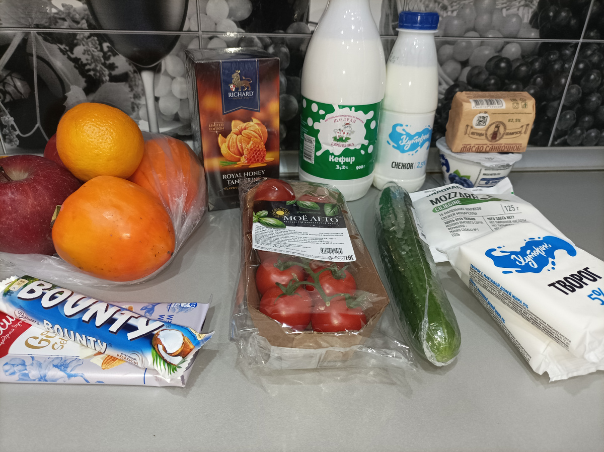 Поскольку неделей ранее в продуктовом магазине за 7 дней я оставила всего чуть более 600 рублей, то прошлая неделя оказалась более затратной чем всегда. Обычно в неделю у меня выходит около 2000 рублей на продукты. Причём, я не покупала ни рыбу, ни мясо. На что же потратила эту сумму? Давайте посмотрим. Здесь фрукты, молочка, шоколад, чай, овощи и моцарелла на салат, сливочное масло 160 г как любимый продукт за 175 рублей. Творог на запеканку. Ещё покупала шоколадки в новогодние подарки, поэтому чек был немного больше. И сыр за 119 рублей в морозилку на затирку. Три шоколадки вышли по 43 рубля в чеке, хотя ценник был 48 рублей. А молочная оказалась 69 🤷♀️ Здесь всё просто - хлеб 🍞 за 45 рублей Здесь недорогие яйца, спелый авокадо, сыр, молоко, творог был по 56 рублей. Один до 24 ноября, второй до начала февраля. Сырки очень вкусные! Впервые такие пробовала, рекомендую, и первый, и второй. В Магните расплатилась по СБП и сразу получила кэшбэк 5% на карту. Пошла за семечками для с