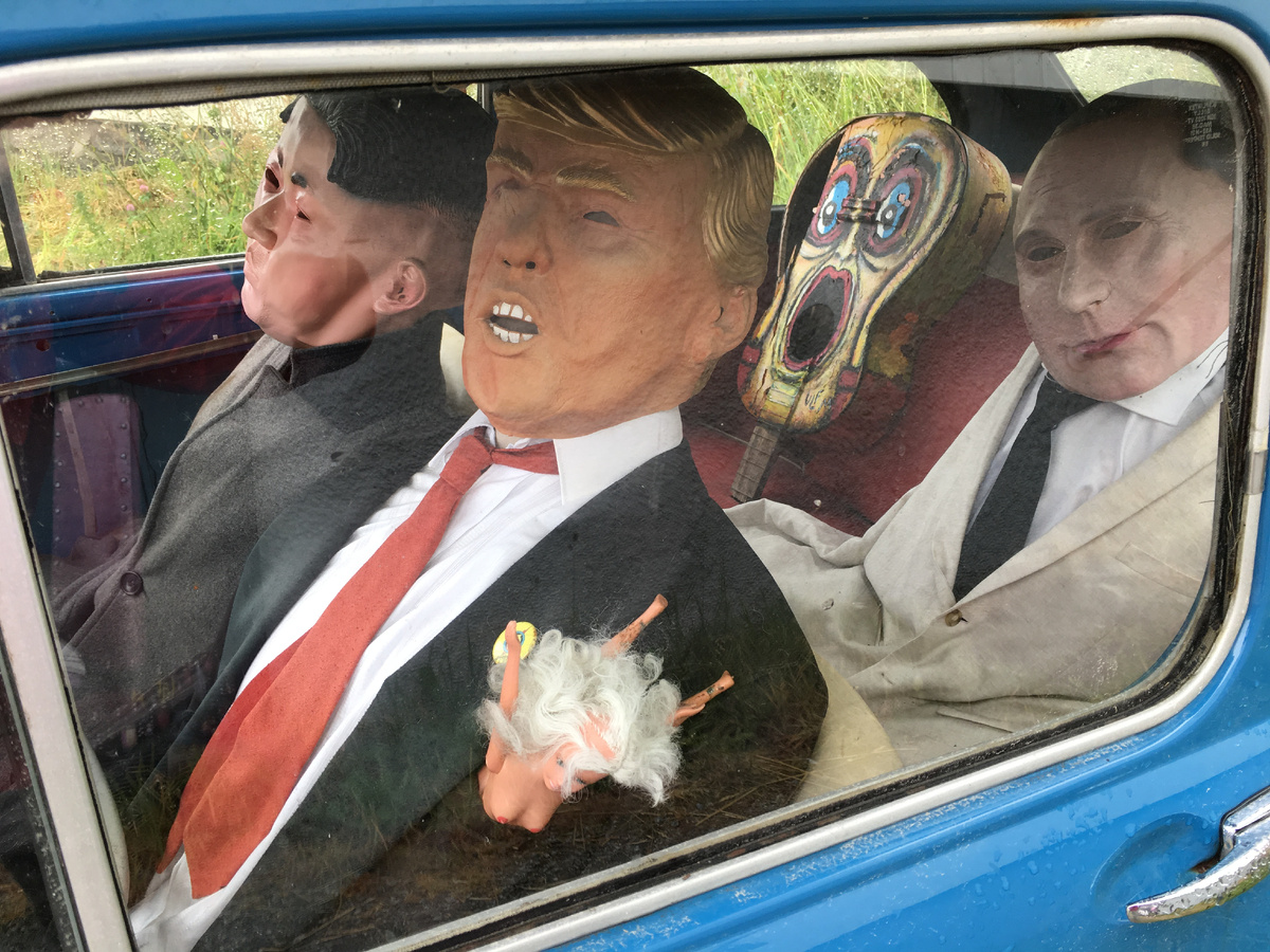 А вот кто тот умник, который пытается испортить поездку парням, Обама, муж Хиллари Клинтон или Зеленский, - большой вопрос. В 2019 году мы несколько недель ходили на паруснике по заполярной Норвегии. В одном из колоритных заполярных городков, категории «норвежское зажопье», я приметил вот такой арт-объект или инсталляцию – назовите, как хотите. Справка: Арт-объект - это предмет, необычный, созданный для привлечения внимания, в который создатель вложил некий смысл. Инсталляция - пространственная композиция, созданная из различных элементов и являющая собой художественное целое. Учитывая, что именно в этот период Дональд Трамп был 45-м президентом США, то автор явно вложил определённый смысл. И усадил в одну малолитражку еще и ВВП вместе с северокорейским марксистом, что тоже неспроста. За рулём Мира, вернее NECKARа (вариации на тему FIAT-600) – Дональд Трамп. Остальные – пассажиры. В принципе, на тот момент… ну, может, и логично. Чьи ноги торчат из-под переднего бампера – большой вопро