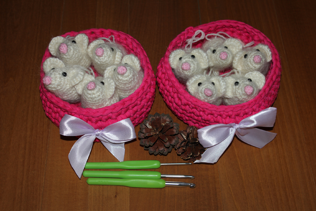 Мне очень нравятся мышки) Не знаю, почему, но с детства любимыми игрушками были именно мыши. Не зайчики-кошечки-собачки, а мыши... Моя комната была практически завалена мышами разных (чаще всего небольших) размеров)) Особое удовольствие в своем вязальном деле я получила в 2019 году при подготовке к году Крысы (2020год). Мышей было связано ооочень много) Кстати, маленьких мышек, которые планировались как елочные украшения, покупали еще и в качестве игрушек для кошек. Почти всех мышек раскупили (но пару штук моей кошке все-таки удалось загнать под холодильник).