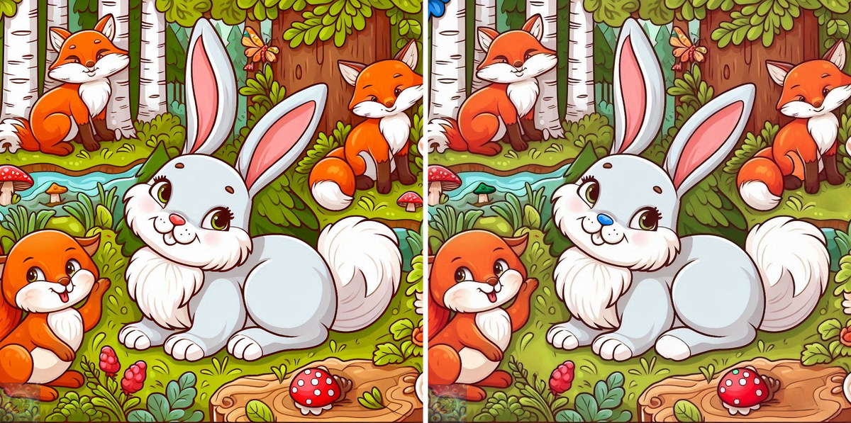 Летний лес — место, где всё дышит жизнью. Тёплый ветерок шелестит листвой, вокруг зелень и уютная тишина. Но если приглядеться внимательнее, тут есть кое-что интересное! На картинке не только зайчик устроился, наслаждаясь природой, но и хитрая лиса где-то притаилась. А теперь внимание! Этот летний пейзаж — не просто красивая картинка. Здесь спрятаны 11 отличий, которые вам нужно найти. Это отличный тест на внимательность! Может, получится заметить их все за пару минут? Или придётся включить «режим детектива» и хорошенько изучить каждую деталь? Где-то листочек не такой, цветочек другого оттенка, а может, у лисы или зайчика что-то изменилось? Кто знает... Внимание к деталям — вот ваш главный инструмент! Готовы? Тогда вперёд, включаем зоркий глаз и погружаемся в лесную головоломку! Ну что, как успехи? Удалось найти все 11 отличий? Если да, то поздравляем — вы настоящая «лесная сова» с великолепным зрением! А если пару отличий всё же ускользнули от взгляда, не переживайте: это повод ещ