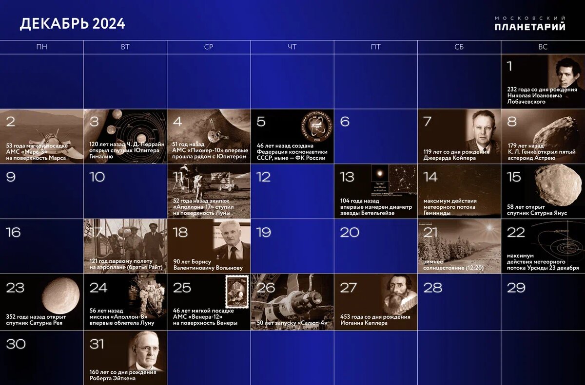 Избранные даты и события декабря 2024 года в астрономии и космонавтике: 1 декабря – 10 лет назад, 1 декабря 2014, на конференции «Планк 2014», проходившей в Ферраре, были обнародованы основные космологические результаты работы космического телескопа «Планк», в течение нескольких лет изучавшего вариации космического микроволнового фонового излучения. 2 декабря – 50 лет назад (02.12.1974) «Пионер-11» — автоматическая межпланетная станция НАСА, предназначенная для изучения Юпитера и Сатурна, пролетела мимо Юпитера на расстоянии около 40 тысяч км от кромки облаков и передала подробные снимки планеты. 2 декабря – 10 лет назад (02.12.2014) состоялся запуск «Хаябуса-2» — автоматическая межпланетная станция Японского агентства аэрокосмических исследований (JAXA), предназначенная для доставки образцов грунта с астероида класса C. 3 декабря – 120 лет назад, (3.12.1904) американский астроном Ч. Д. Перрайн на Ликской обсерватории открыл новый спутник Юпитера, шестой по счету в порядке открытия, вп