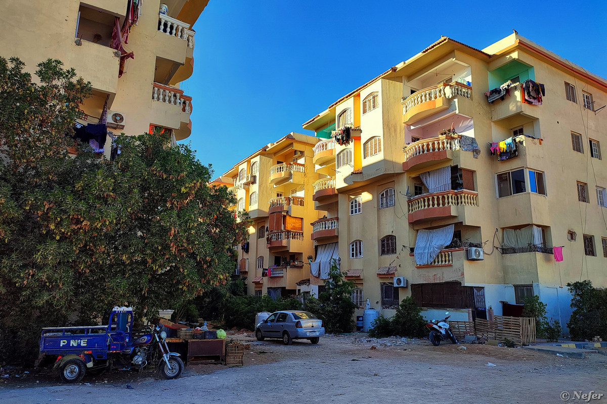 Еще один социальный район Хургады - Мубарак 8. Назван в честь бывшего президента Египта Хосни Мубарака. Это муниципальное жилье, построенное на государственной земле. Мубарак 8 строился в 2004-2007 годах, получается ему меньше десяти. Мубарак-8 начинается сразу за районом Мубарак-5. Он также построен вдоль шоссе El-Nasr, но расположен больше вглубь. Возможно, это работа над ошибками, или случайно получилось, но вышло более удачно. Визуально здания не отличаются от других Мубараков. Все те же балясины на балконах. Просто типовой спальный район. По ощущениям меньше, чем Мубарак-5 и Мубарак-2. Изначально Мубарак-8 предназначался для малообеспеченных семей. По договору собственники жилья не могут продавать жилье иностранцам. Обратите внимание на заложенный кирпичом балкон. Некоторым египтянам он не нужен. Люди всю жизнь спасаются от солнца, многие завешивают окна плотными шторами или даже одеялами. В данном случае совсем уж кардинально. В районе нет ничего, кроме жилых домов, маленькой меч