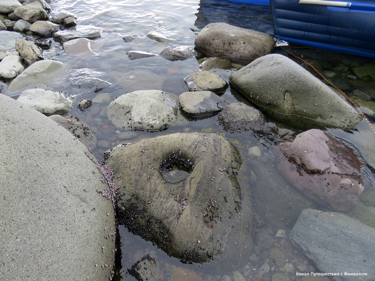 Лунки эти нам хорошо знакомы. Их можно найти в прибрежных валунах или скалах по всей окружности острова. Диаметр у них 15–20 сантиметров, а глубина… С ней немного сложнее. Как правило, они частично засыпаны галькой или землей. Вероятнее всего, тоже около 20 см. Разумеется, они рукотворного присхождения.