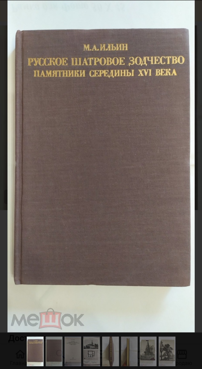 Долгожданная продажа на Мешке после долгого перерыва! Продалась книга "Русское шатровое зодчество. Памятники середины XVI века. Проблемы и гипотезы, идеи и образы" Автор книги М.А. Ильин, издана в 1980 году, в Москве, в издательстве "Искусство". Книга посвящена шатровым храмам времен Василия III и Ивана IV Грозного. Русское шатровое зодчество середины XVI в. еще во многом остается загадкой для исследователей, которые спорят о происхождении шатровых форм, связывая появление в архитектуре шатрового завершения то с деревянными шатровыми храмами, то с башнями крепостей. Автор выдвигает свою гипотезу. Половину книги занимают черно-белые иллюстрации храмов, рисунки, фрагменты, схемы, планы, документы. Книга из домашней библиотеки, сохранность её очень хорошая, в отличие от суперобложки, которую время не пощадило. Книга не редкая, на Мешке таких же порядка десяти, цены от двухсот до пятисот рублей . Свою книгу оценила в двести пятьдесят рублей, выставила больше полугода назад. Два чело
