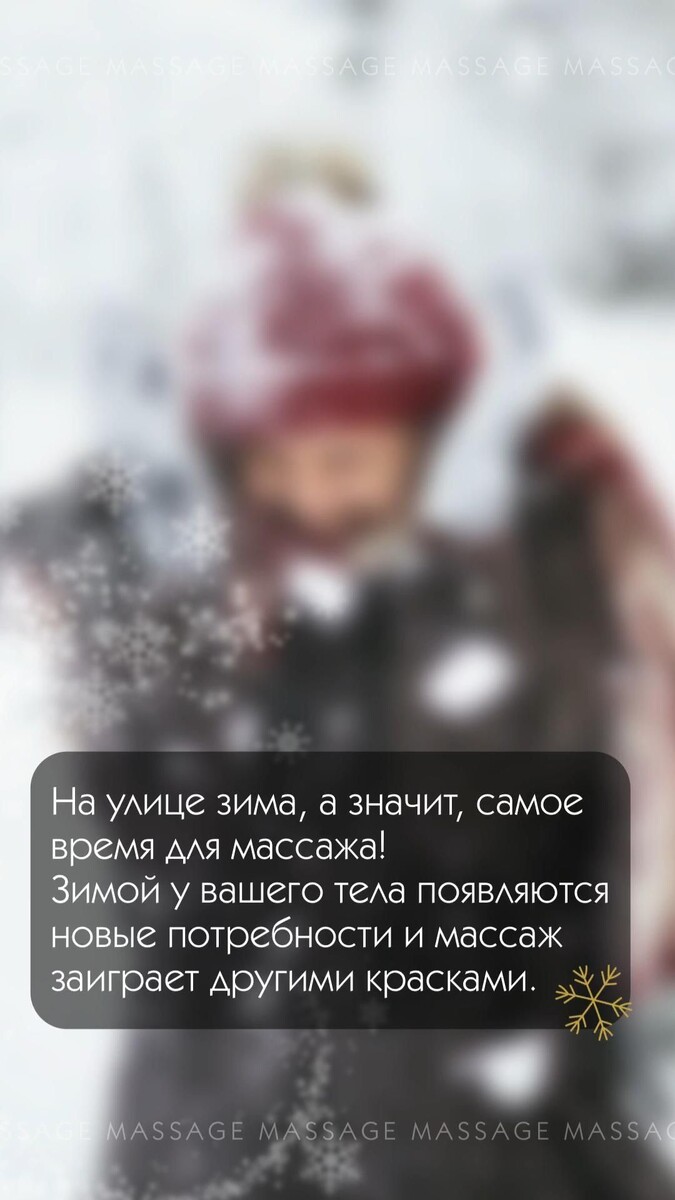 ☃️ Зима приносит с собой холода, ❄️ 🍷 морозные дни и тёмные ночи 🌒 – мы больше сидим в четырёх стенах, меньше двигаемся, больше спим и едим. Почему бы не помочь организму и поддержать своё здоровье в этот период, записавшись на массаж? Сегодня мы расскажем вам о пользе массажа в холодное время года. ☃️ Больше не дрожим от холода! Массаж поможет вам согреться в холода! ☀️ Во время массажа улучшается кровоснабжение тканей, что способствует повышению эффективности терморегуляции. Регулярный массаж не даст вам замёрзнуть этой зимой, мы вам гарантируем! Многие исследования показали, что массажная терапия повышает уровень дофамина и серотонина (гормоны, которые связаны со счастьем и благополучием), снизить кортизол (гормон стресса). Также подтверждено, что восстановительный массаж ускоряет выработку эндорфинов – естественное обезболивающее. 💊 ответ:❄️ Зима – самое время сделать массаж👌Польза массажа зимой. ⠀Лето ушло, на носу – зима. В это время природа меняется.Но не только она подверж