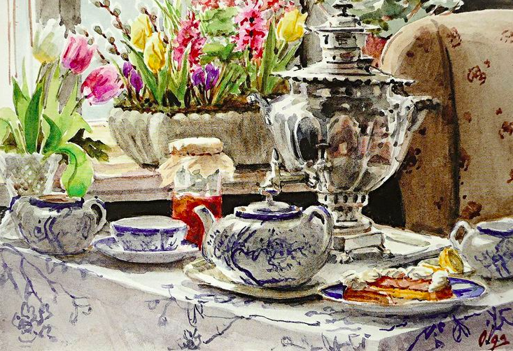Картина была написана в 1935, когда Куликовские жили в Баллерупе. На столе, покрытом скатертью, - начищенный до блеска самовар, вывезенный из России. На столе чайный сервиз, расписанный хозяйкой. На тарелке – аппетитный кусок пирога.