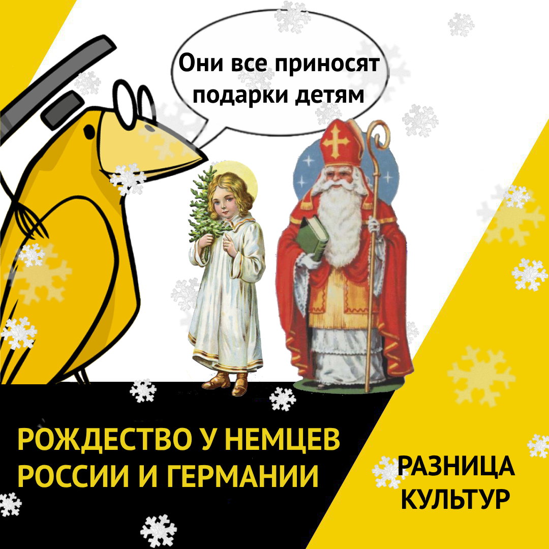 Рождество – главный праздник не только у немцев Германии, но и немцев России. Тех, что прибыли в Россию со времён Екатерины II и Александра I. Рождеству предшествует специальный период подготовки – 4 воскресенья Адвента (Advent). В конце ноября – начале декабря немцы устанавливают рождественские ясли (Weihnachtskrippe). Их по возможности устилают сеном и укладывают в них куклу, олицетворяющую младенца Иисуса. Гораздо более современный вестник приближающегося Рождества – рождественский, или адвентский, венок (Adventskranz). Его плетут из еловых или сосновых веток и украшают лентами и свечами. На венок ставят четыре свечи и каждое воскресенье Адвента зажигают по одной. Кстати, придумали его только в 1839 году, поэтому венок, штоллен и Адвент-календарь были характерны исключительно для Западной Европы. При смешении традиций в XX-XXI веках российские немцы тоже заимствовали эти элементы Рождества. В канун Рождества в домах устанавливают и украшают ёлку (в Германии – Weihnachtsbaum (рождест