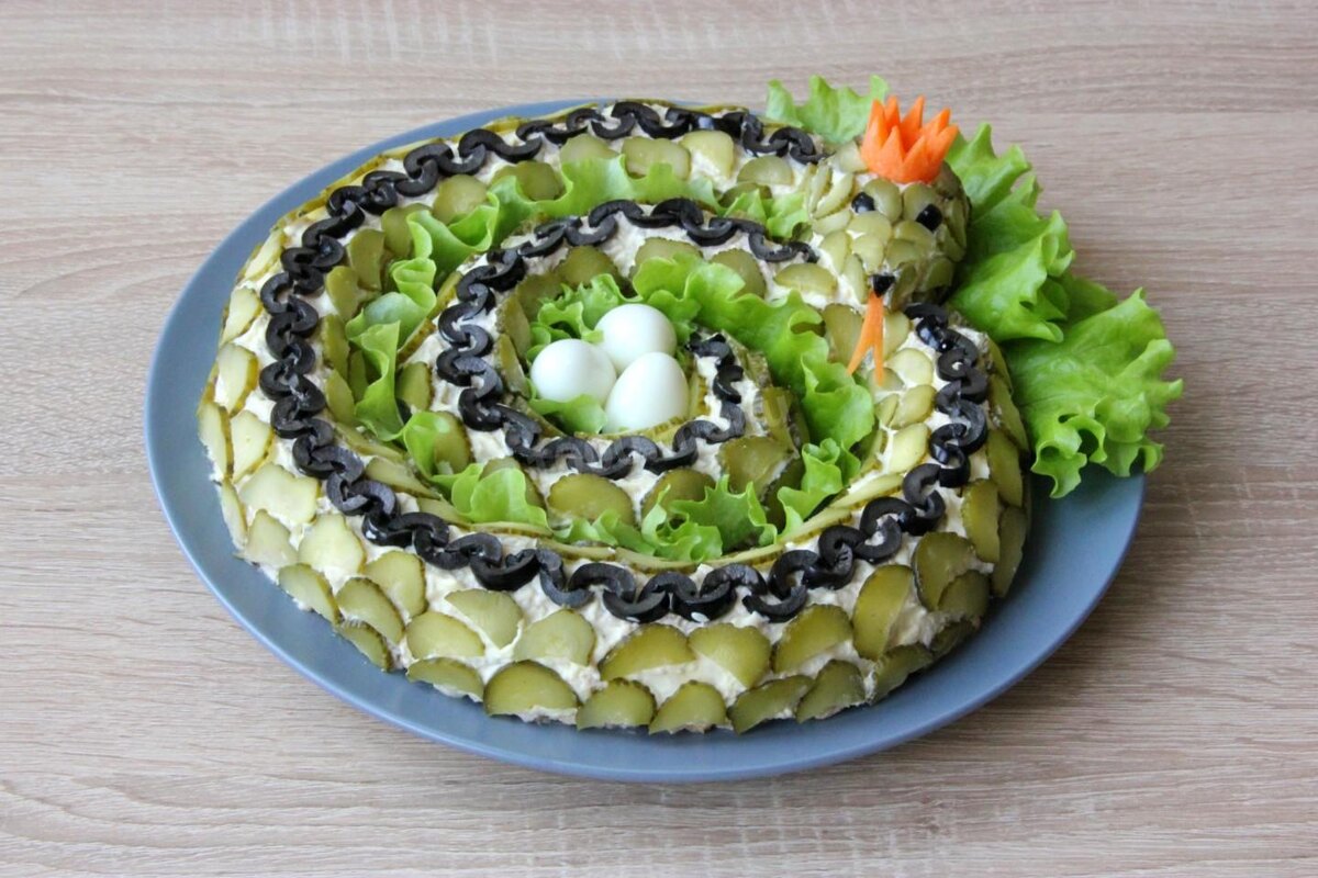 Используйте зелень для оформления: можно сделать хвост и голову змеи из зелени. - Подача:Уберите салат в холодильник на 1-2 часа для пропитки. Подавайте охлажденным.