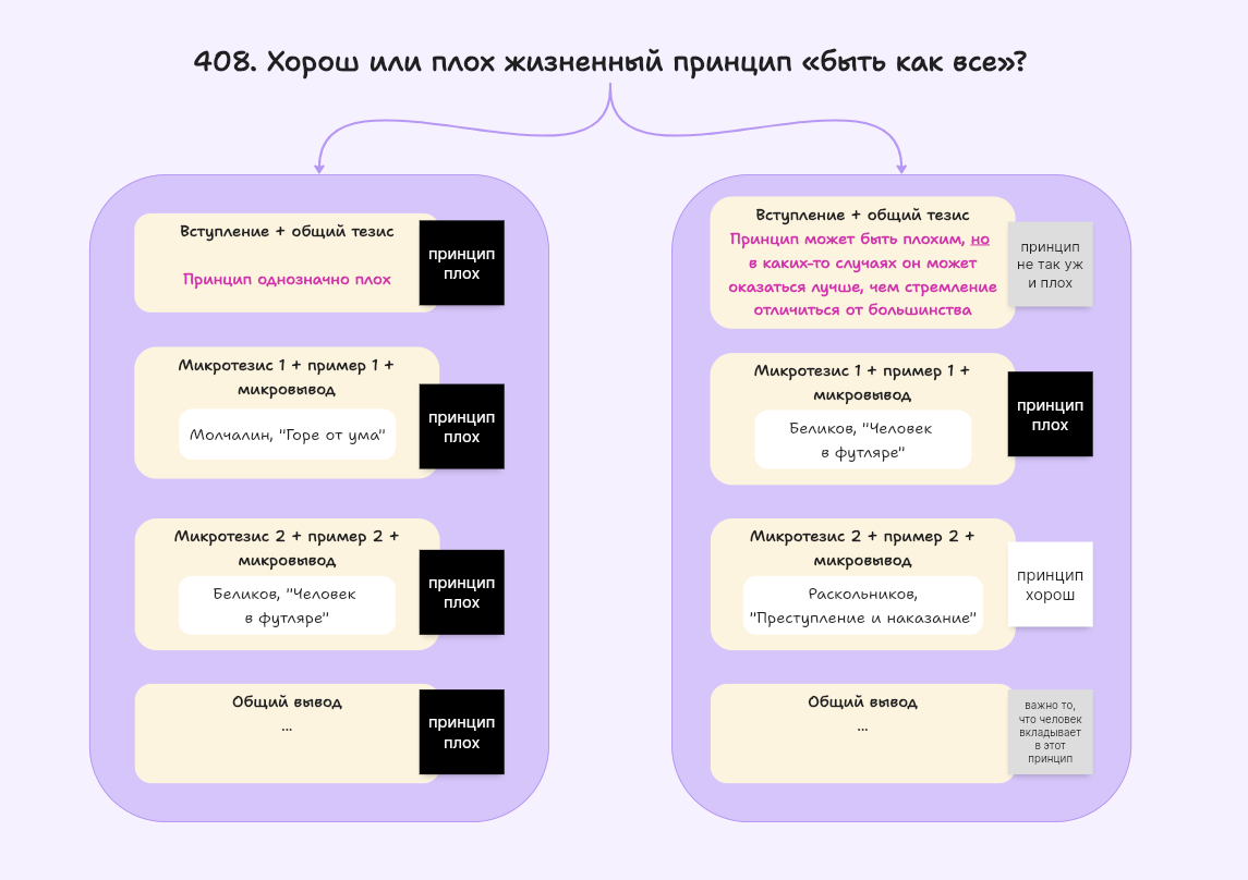 Конечно, первый вариант гораздо проще, линейнее. Двухчастный тезис отрабатываем с теми, кто уверен в себе на все 💯 и много практиковался в написании рассуждений.