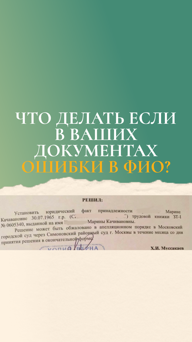 - Исправлять в суде. Есть даже глава в кодексе, которая называется «особое производство» и статья «установление фактов, имеющих юридическое значение». Моему клиенту удовлетворили иск по исправлению ошибки в трудовой книжке. Ошибка в отчестве в трудовой книжке мешала зачёту стажа работы в ПФР и начислению пенсии. Теперь ошибка исправлена, а дальше будем обращаться в ПФР за признанием трудового стажа, наработанного в Грузии для увеличения пенсионных выплат. Потому что кроме записей в трудовой об этом стаже, у ПФР - никаких сведений нет. Но истец-то в этом не виноват🫣 Ко мне можно обратиться за консультацией: • по телефону:89963074966 • по эл.почте:jurist_tsarevskaya@mail.ru • VK:https://vk.com/altsarevskaya