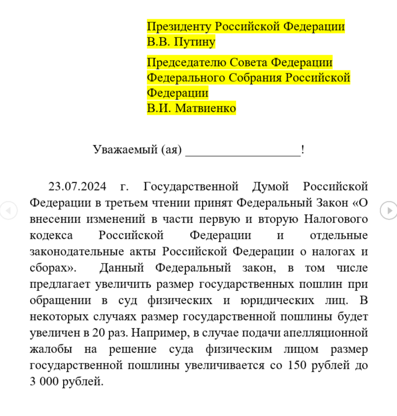 В.И. Матвиенко Уважаемый (ая) __________________! 23.07.2024 г. Государственной Думой Российской Федерации в третьем чтении принят Федеральный Закон «О внесении изменений в части первую и вторую Налогового кодекса Российской Федерации и отдельные законодательные акты Российской Федерации о налогах и сборах». Данный Федеральный закон, в том числе предлагает увеличить размер государственных пошлин при обращении в суд физических и юридических лиц. В некоторых случаях размер государственной пошлины будет увеличен в 20 раз. Например, в случае подачи апелляционной жалобы на решение суда физическим лицом размер государственной пошлины увеличивается со 150 рублей до 3 000 рублей. Таким образом, данный Федеральный закон в части установления новых размеров государственных пошлин при подаче обращений в суд, фактически лишает или сильно ограничивает часть граждан в реализации их ко