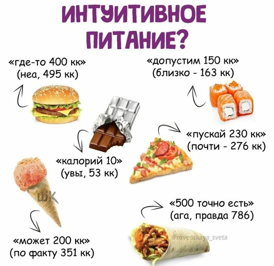 Всем добрый день! Меня зовут Вера, мне 39 лет, недавно я стала мамой второй раз, скидываю лишнее после беременности и родов, начальный вес 75 кг, промежуточный результат 62 кг. Худею, КАК Я ХОЧУ! Иногда так надоедает считать калории, взвешивать, записывать.... И начинаешь задумываться, может попробовать питаться интуитивно? Это когда, кушаешь по голоду физическому и все, что требует организм... Но вот только, если у человека есть лишний вес, значить у него не сложились "отношения" с едой. Произошла подмена понятий, еда - топливо удовольствие. И при таком раскладе не получится питаться интуитивно в пределах своей нормы БЖУ. Давайте же рассмотрим плюсы и минусы такого питания Плюсы ❗Не зависимости от весов; ❗Не нужно тратить время на занесение данных в приложение. Минусы ❗Нет понимания сколько съедено калорий; ❗Сложно контролировать свой рацион по БЖУ; ❗Сложно "услышать" себя. Хотя я на подсчете давно, с 2019 года, и вроде уже натренировала свою насмотренность, но как по