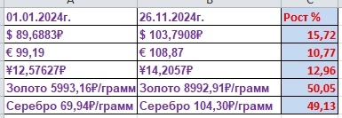 Рост драгметаллов и валют за период с 01.01.24 по 26.11.24г. в одной табличке. Не является ИИР
