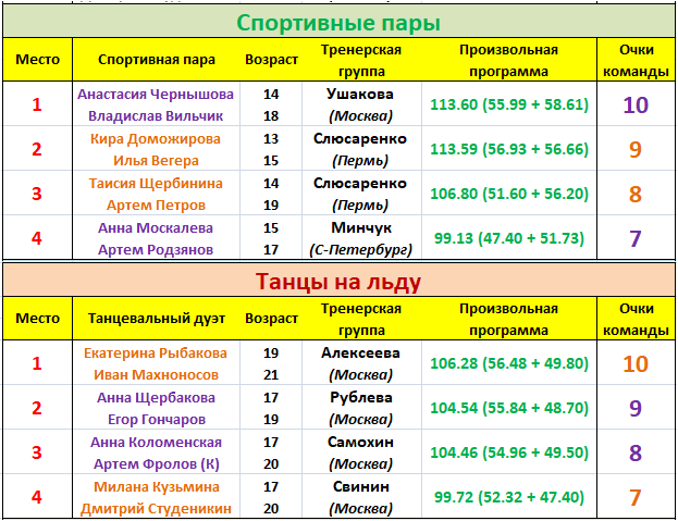В парах 1-2 место разделила лишь 1 сотая балла в пользу лидеров фиолетовых, будущих Чемпионов России, Чернышовой/Вильчика, что в итоге сыграет затем свою важную роль. При этом все пары очень сильно волновались и никто не избежал ошибок. Следующими на лед вышли девушки :