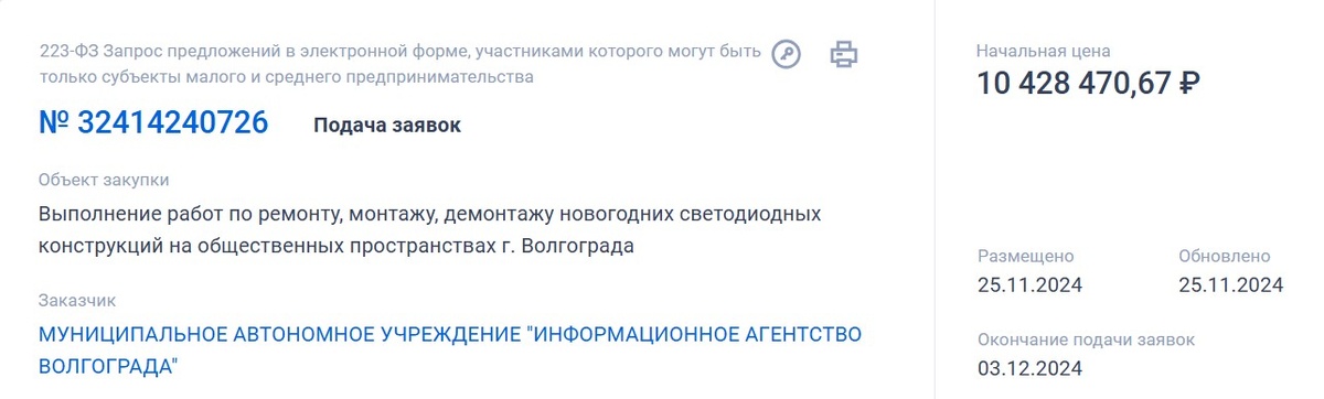 На портале госзакупок МАУ «Информационное агентство Волгограда» объявило поиск подрядчика, который отремонтирует, установит, а затем демонтирует новогодние украшения на территории города. Стартовая цена закупки впечатляет: 10,4 млн рублей. При этом никаких новых украшений подрядчик закупать не будет. По условиям контракта, исполнителю работ надлежит до 20 декабря отремонтировать и установить на обозначенных местах 18 световых инсталляций. Это уже хорошо знакомые волгоградцам по прошлому и позапрошлому году световые композиции «Свечи»,«Ель», «Световая арка «Семья оленей-2», «Фонтан», «Крылья Ангела», «Снежная Королева», два «Волшебных фонаря», «Новогодняя декорация Камин», «Световая фигура «Часы», а также светящиеся ангелы, подсвечники, гигантский елочный шар, и другие.