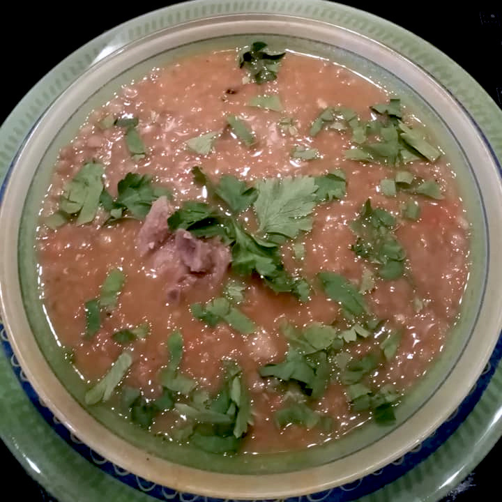 Захотелось горячей чечевичной пряной похлёбки на баранине в «восточном стиле». Я делаю её специально густой, с консистенцией супа-пюре, чтобы можно было есть и без хлеба. На 5-литровую кастрюлю похлёбки у меня пошло 600-700 г бараньей грудинки, полкило зелёной чечевицы, полкило красной, большая луковица, 1 морковка (извините, но без неё никак), 2-3 свежих помидора, половина головки чеснока, зелень. Из баранины варим обычный бульон, и по мере его готовности закладываем туда, предварительно промыв, зелёную и красную чечевицу. Для того, чтобы избавить нашу похлёбку от лишнего жира, я обрезала тот, что был на баранине, вытопила его на сковородке, и уже на этом делала зажарку. Много лука и много-много любых пряностей. У меня практически все, которые были в нашем доме - кумин (зира), шафран, барбарис, карри, приправа для птицы, приправа для плова, чёрный молотый перец, красный, паприка. Когда лук станет золотистым, добавляем натёртую морковь и тоже натёртые помидоры. Чечевица должна хорошо р