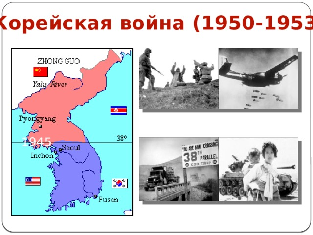 Японскому правлению пришёл конец, а полуостров был разделён по 38 параллели на две оккупационные зоны: американскую и советскую. Тогда и США, и СССР полагали, что разделение это временное, и вскоре Корея станет единой страной. Вот только в мире уже формировалось два мощных блока, деливших между собой политическое влияние, начиналась Холодная война.