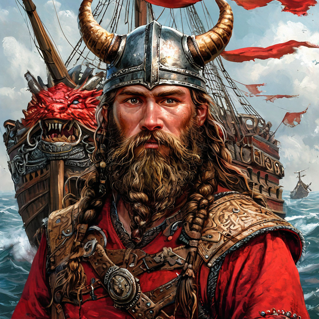 Добравшись до заветной цели, девушка долго копалась в каких-то картонных коробках, а потом извлекла на свет потертую и местами поцарапанную картину. На ней был изображен мужчина, внешне очень напоминавшего викинга из книг. По крайней мере, именно так я их себе представляла. У него были длинные заплетенные в две косы темные волосы до груди, кустистая борода и большой шлем с двумя рогами. На мужчине была одета красная рубаха и сверху нее кольчуга с круглыми металлическими вставками на груди и плечах. Сзади него был нарисован корабль с резным носом в виде ярко-красного дракона.
