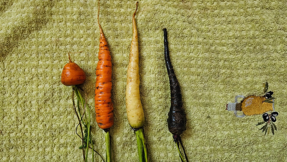 В рубрике #самавырастила сегодня 4 сорта моркови, которые я сажала в этом году. На плов искала сорт 😂 Слева направо. Первая очень смешная, вот такие кругленькие "бочонки лото". Видимо, десертные, для сервировки стола. Вторая морковка обычная, чисто для сравнения положила. Третий сорт - желтая морковь для классического плова. Я ее специально искала, потому что в магазине обычно не купишь. И последняя, самая темная, сине-фиолетовая морковь неполиткорректного сорта "Негр". Тоже, наверное, для украшения, для необычных салатов. Разницу вкусов я не поняла, но руки красит хорошо 🤣 Что у нас ещё есть? Голубичка. Привезли веточку с голубичных болот, посадили в дальнем сыром и холодном углу огорода и через несколько лет получился вполне себе плодоносящий куст. Не надо на марь тащиться, отдаваться на съедение комарам и медведам. Это первые овощи. Самое вкусное после первой майской зелени - это июньские и июльские овощи. Ягод всегда много: Вкусный и полезный десерт. Даже эндокринолог одобряет.