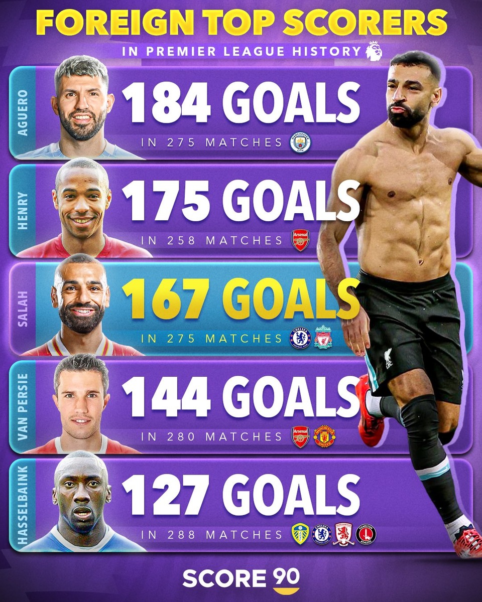 Английская Премьер-лига всегда была магнитом для лучших футболистов. За легионерами местные болельщики следят очень пристально – среди них есть особая категория игроков, чьи имена стали синонимом голевых подвигов и побед. Взглянем на лучших. Эти ребята не только покорили сердца болельщиков, но и переписали страницы истории АПЛ. Серхио Агуэро (Аргентина) Лучший бомбардир в истории «Манчестер Сити». Запомнился феноменальным голом в последнем туре сезона-2011/12, который принёс «Сити» чемпионский титул. Годы в АПЛ: 2011–2021 Голы: 184 в 275 матчах Тьерри Анри (Франция) Один из самых техничных и зрелищных форвардов в истории лиги. Помог «Арсеналу» стать непобедимыми в сезоне-2003/04. Шесть раз подряд становился лучшим бомбардиром клуба. Годы в АПЛ: 1999–2007, 2012 Голы: 175 в 258 матчах Мохамед Салах (Египет) Цените момент. Один из самых эффективных вингеров в истории лиги, забивающий в среднем по 20 мячей за сезон. После 30 расширил функционал и становится синонимом стабильности. Годы в А