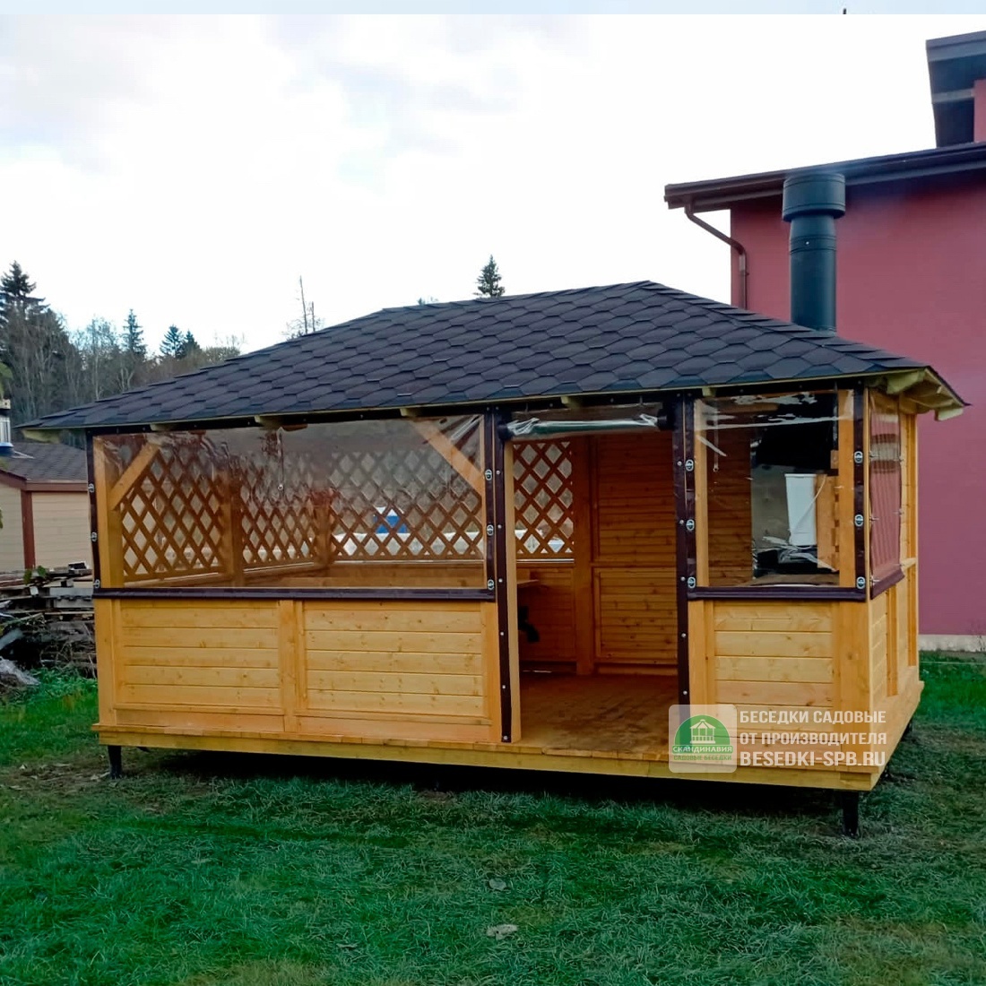 Деревянная беседка площадью застройки 3х5м, общей площадью 15м2 и стоимостью от 258 800 рублей. От нашего подрядчика Скандинавия